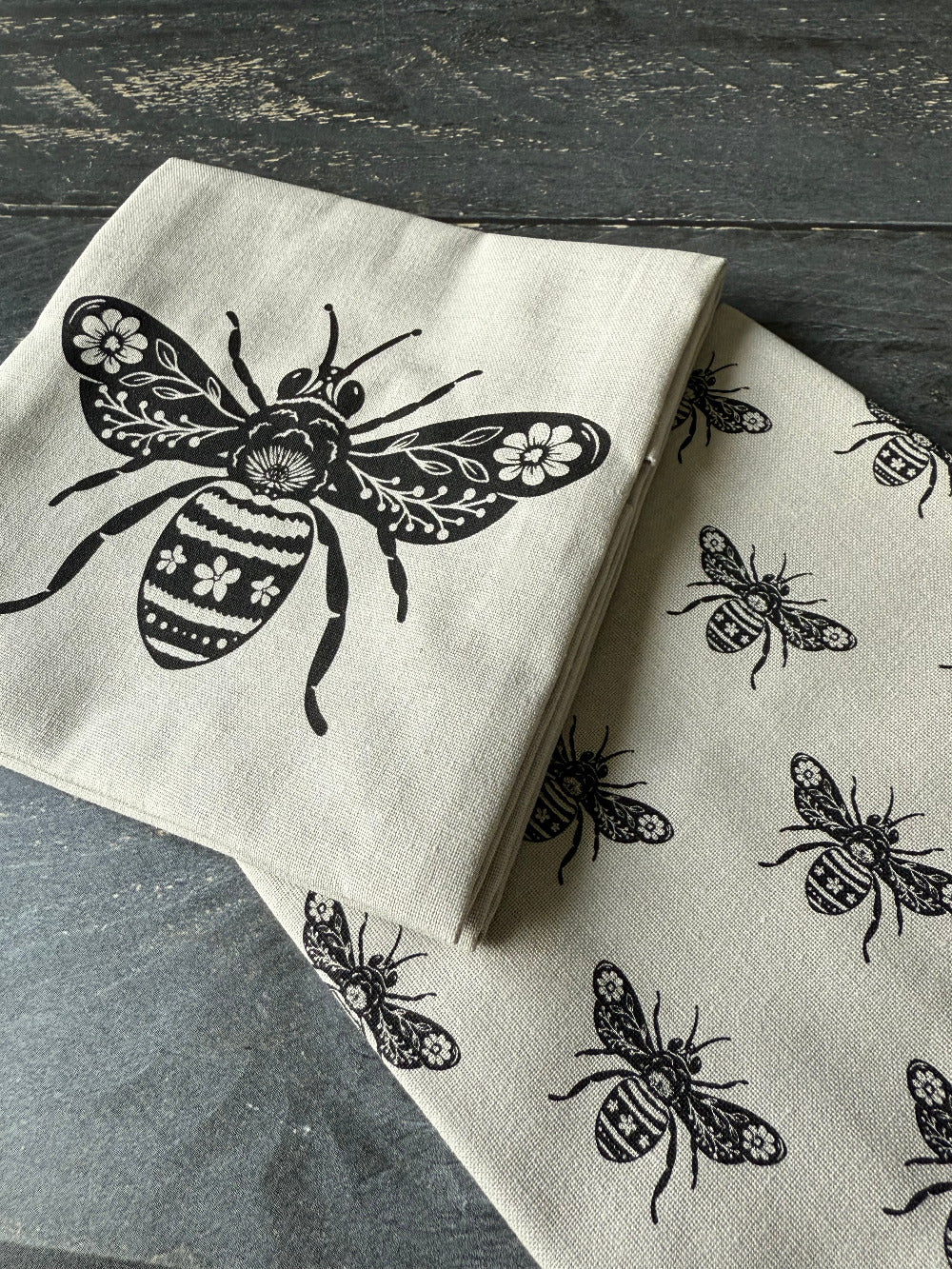 - Two towels are included in this set. One with the single large bee logo, and one with the smaller bee pattern.