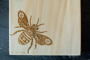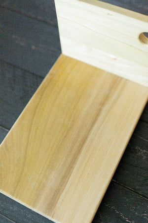 Every cutting board is hand made at our farm in North Alabama, constructed with solid hard woods, and finished with our Wood Butter. Due to the custom nature of the natural elements used, there may be some differences in the wood grain/color, as well as the details of each piece.